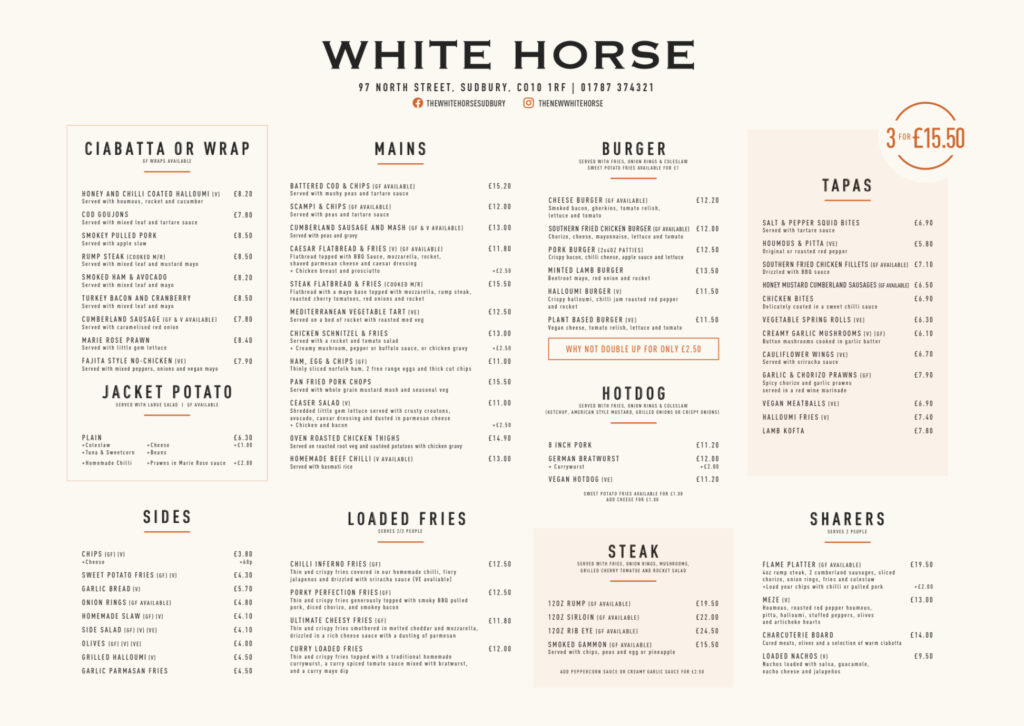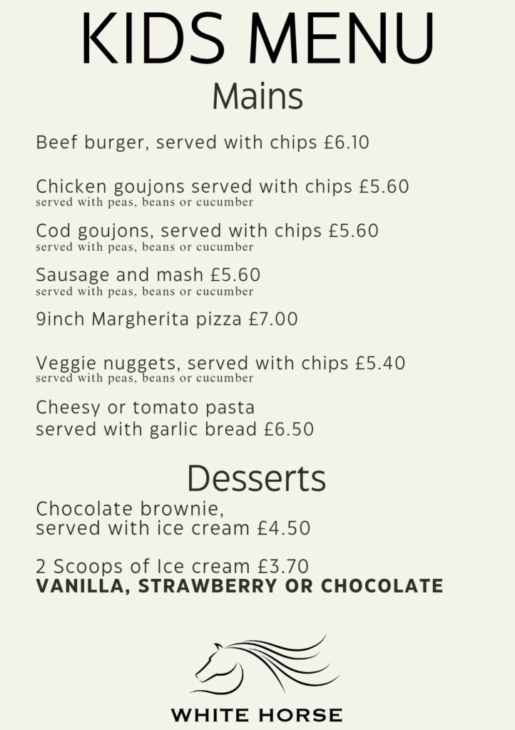 At the White Horse we pride ourselves on serving good quality and traditional food for all the family. Check out our great value menus below, which we’re sure you’ll love, especially our generous portions!